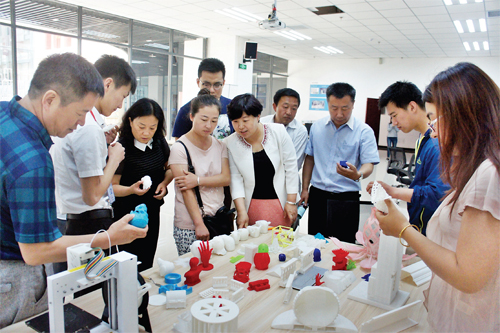 6 月1 日上午,市科技局對我市的兩個(gè)眾創(chuàng)空間進(jìn)行掛牌。目前我市已建成7 家眾創(chuàng)空間,搭建了廣闊的平臺,鼓勵(lì)大學(xué)生創(chuàng)業(yè)。圖為市科技局和忻府區(qū)科技局的領(lǐng)導(dǎo)以及新聞媒體人員在大學(xué)生創(chuàng)業(yè)園區(qū)的眾創(chuàng)空間參觀3D打印。(楊峻峰 攝)