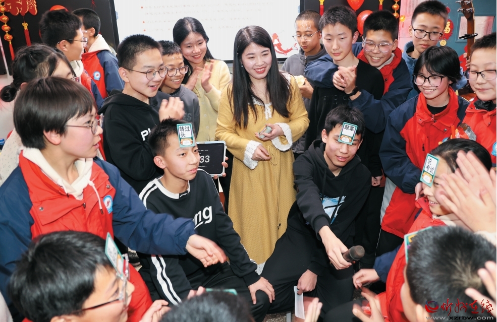 2024年12月30日,忻州師范學(xué)院附屬中學(xué)舉行班級(jí)元旦聯(lián)歡晚會(huì),喜迎新年。圖為老師和孩子們一起做游戲。(記者 張存良攝)