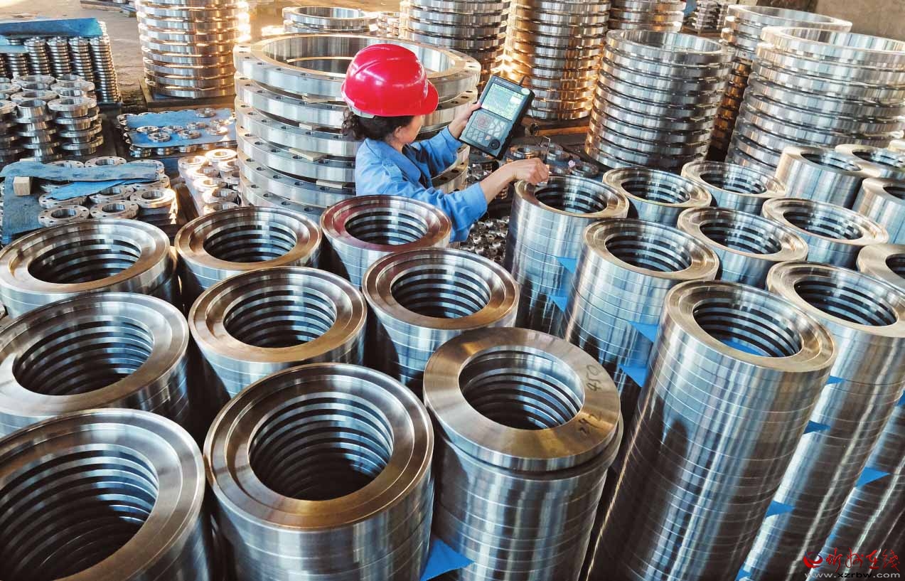 新世紀法蘭有限公司質量安檢員正在為產(chǎn)品做超聲波質量檢測。 張晉蘭攝