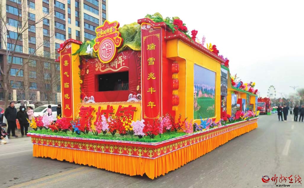 正月十四上午九時,六輛精心設計的主題彩車沿濱河路徐徐前行:東城街村彩車兩側(cè)以超大電子屏播放全鎮(zhèn)發(fā)展風貌與規(guī)劃;南城街彩車以滿載果蔬的渡輪形象寓意豐收與希望;北城街彩車在花的海洋中展示本土名優(yōu)特產(chǎn)品與風景名勝;西城街彩車以高山起伏的造型展示繁城鎮(zhèn)特色果品和農(nóng)牧產(chǎn)業(yè)概況;南關村彩車以“繁榮盛峙”造型展現(xiàn)紅旗模范村的責任擔當;西義村彩車通過“高臺表演”形式營造歡樂喜慶的氛圍。每輛彩車高達5米,吸引了眾多群眾駐足觀看,紛紛舉起手機記錄這“行走的民俗畫卷”。