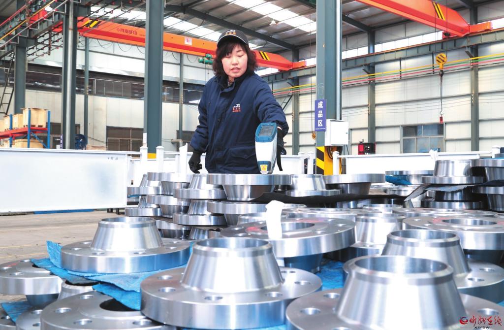 2月25日,定襄縣山西艾斯特耐茨鍛造有限公司開啟“忙碌模式”,鼓足干勁趕訂單、忙生產(chǎn)。圖為檢測員正在對鍛造產(chǎn)品進行光譜檢測。 (