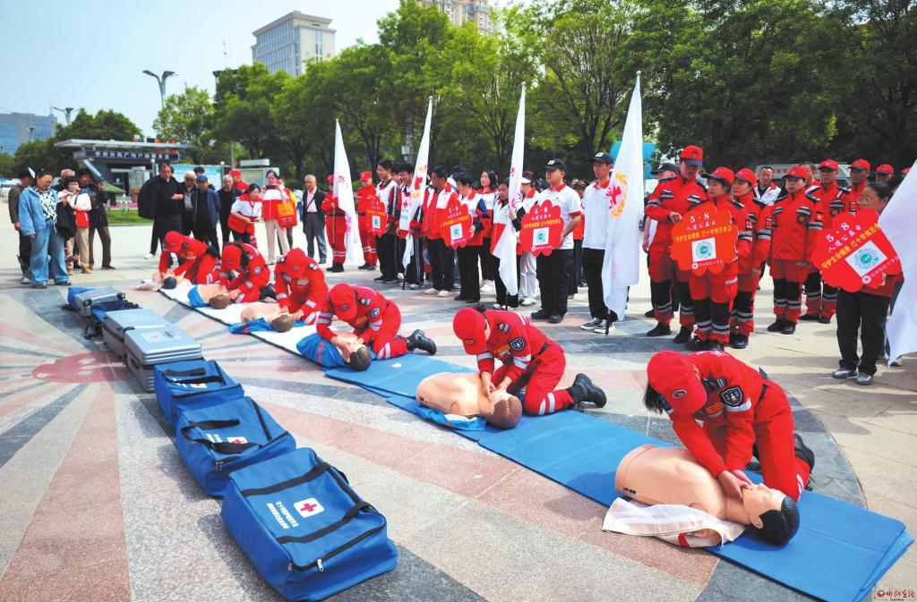 5月8日,忻州市紅十字會(huì)在忻州城區(qū)體育廣場(chǎng)舉行紀(jì)念“5·8世界紅十字日”暨“紅十字博愛周”宣傳活動(dòng)。圖為救援隊(duì)員進(jìn)行救護(hù)演練。(記者 張存良攝)