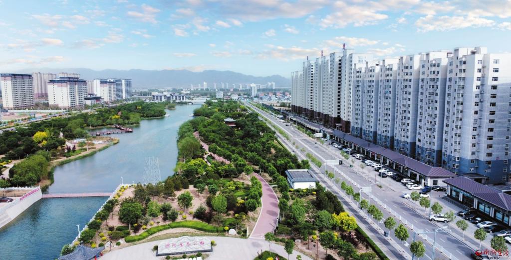 初夏時(shí)節(jié),原平城區(qū)沙河生態(tài)公園內(nèi)草木蔥蘢,與藍(lán)天白云、城市建筑構(gòu)成一幅水清、岸綠、景美的城市生態(tài)畫卷。圖為沙河生態(tài)公園一角。(褚震 攝)
