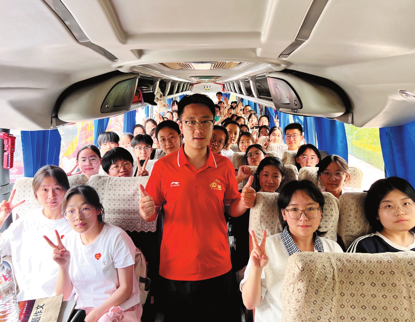 圖為第一場(chǎng)考試結(jié)束后,忻州實(shí)驗(yàn)中學(xué)送考車上,師生互相鼓勁加油。趙臻宇攝
