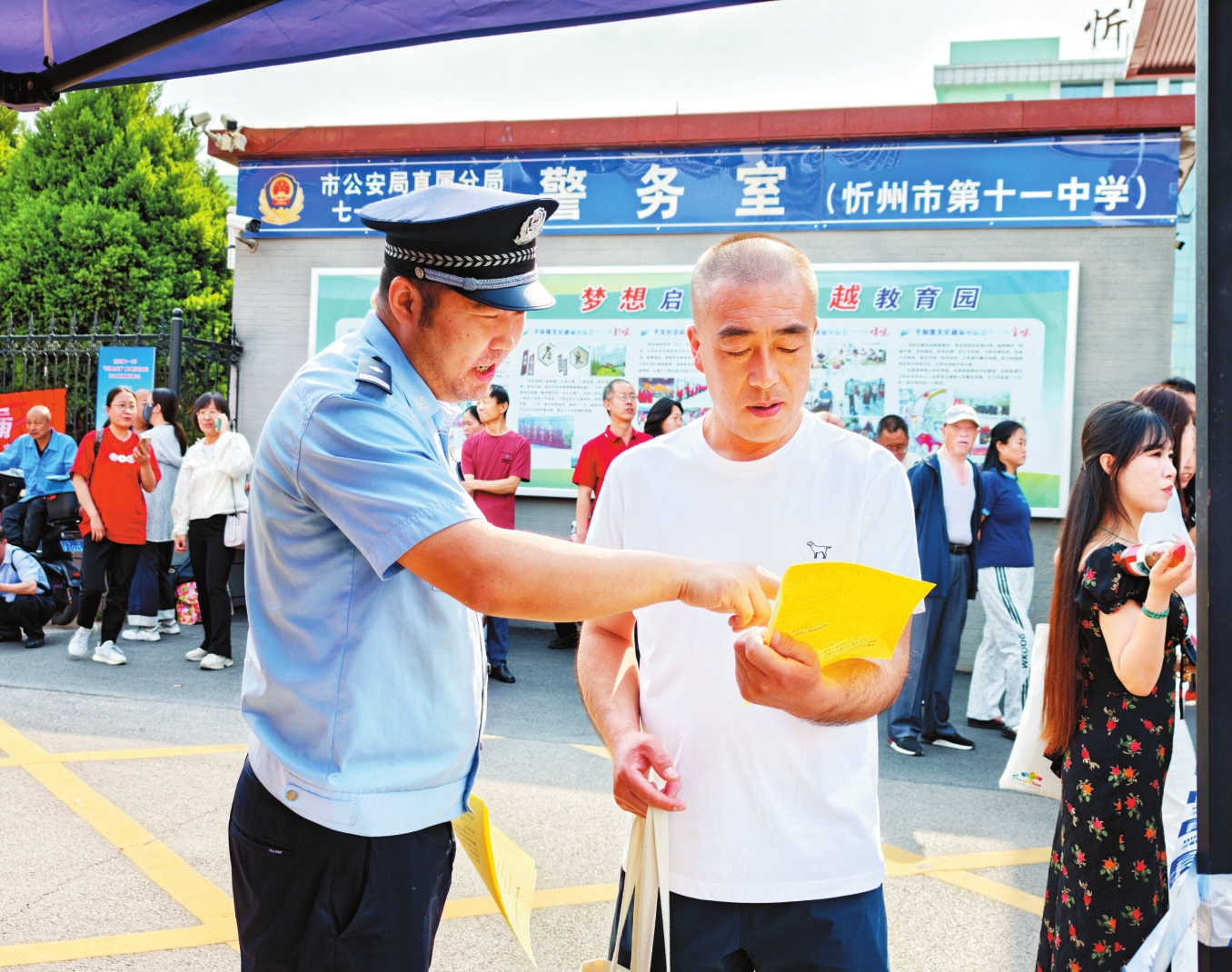 圖為忻州十一中考點(diǎn),民警在宣傳防范電信詐騙知識(shí)。馮偉倫攝