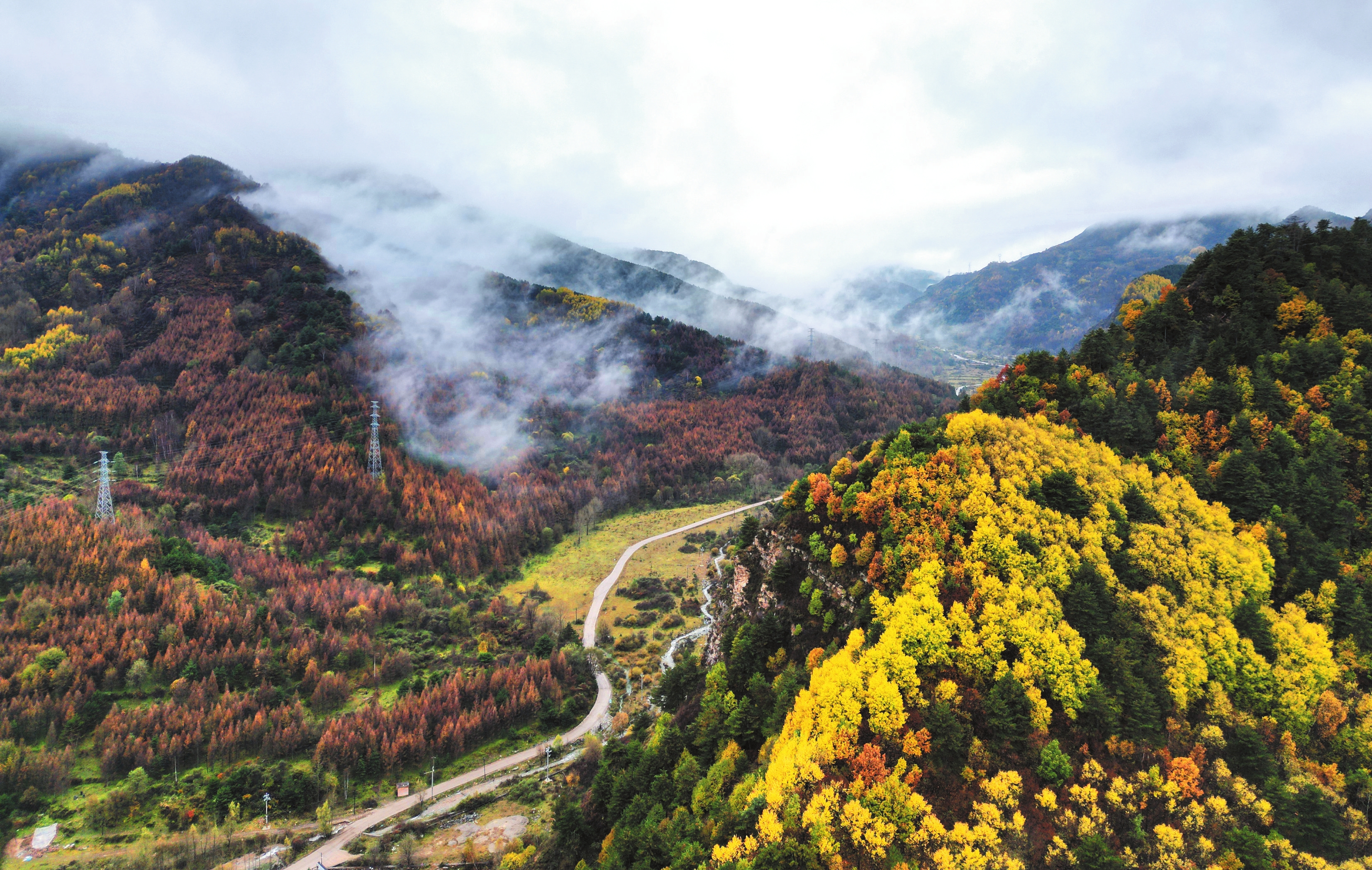 沿盤(pán)山路驅(qū)車(chē)而上,兩側(cè)的華北落葉松與云杉率先奏響秋之序曲。陽(yáng)光穿透枝葉,將針葉染成琥珀色;山風(fēng)過(guò)處,整片林海翻涌著金色波浪。腳下厚厚的落葉層踩上去沙沙作響,散發(fā)著松針與腐殖土混合的清香。在黛螺頂觀景臺(tái),常有云海自山谷間升騰,將五彩斑斕的山林切割成流動(dòng)的色塊,宛如印象派大師筆下的油畫(huà)。