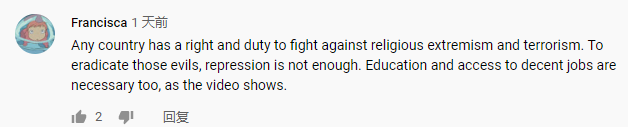 “任何國家都有權(quán)利和義務(wù)打擊宗教極端主義和恐怖主義。要根除這些邪惡……教育和獲得體面工作的機(jī)會(huì)也是必要的?!苯?,一名海外網(wǎng)友Francisca在看完中央廣播電視總臺(tái)旗下CGTN播出的《巍巍天山——中國新疆反恐記憶》紀(jì)錄片后這樣評(píng)價(jià)。
