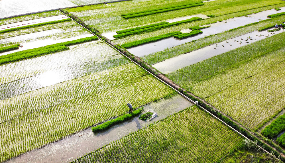 2020年6月14日,農(nóng)民在洛陽市孟津縣會盟鎮(zhèn)黃河岸邊的萬畝優(yōu)質(zhì)水稻種植示范基地內(nèi)移栽水稻秧苗(無人機照片)。新華社發(fā)(黃政偉 攝) 飯碗里的中國好糧