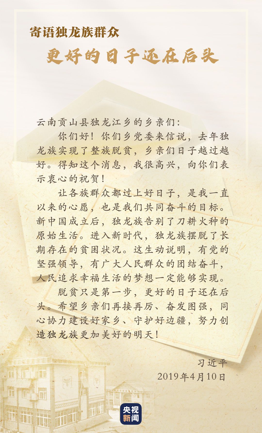 2018年,獨龍江鄉(xiāng)6個行政村整體脫貧,獨龍族實現整族脫貧,基礎設施、特色產業(yè)、社會事業(yè)等都發(fā)生了巨大變化。貢山縣干部群眾再次給習近平寫信匯報脫貧成績,習近平得知后非常高興,向他們表示“衷心的祝賀”,并勉勵鄉(xiāng)親們?yōu)檫^上更加幸福美好的生活繼續(xù)團結奮斗。