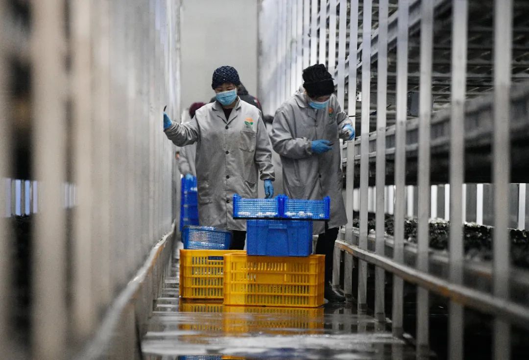 △寧夏銀川市永寧縣閩寧鎮(zhèn)雙孢菇栽培示范基地,農民在采摘蘑菇。