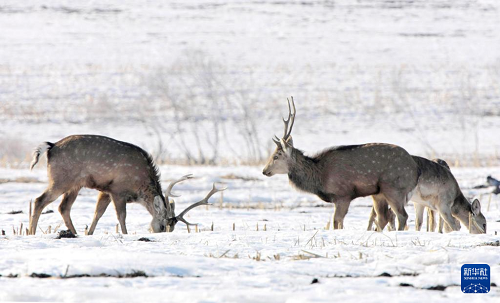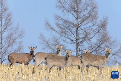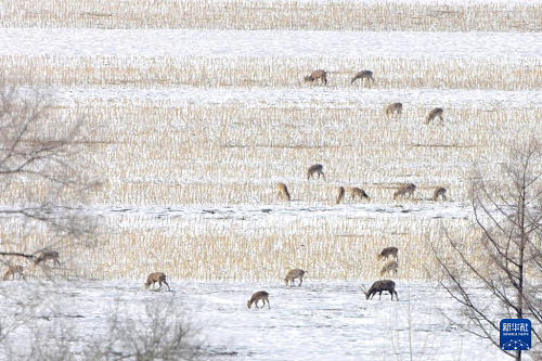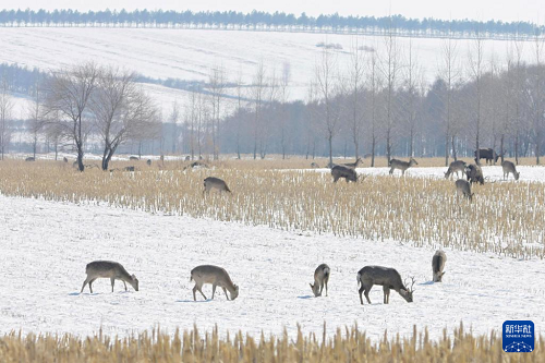 3月18日,野生梅花鹿群在黑龍江仙洞山梅花鹿國(guó)家級(jí)自然保護(hù)區(qū)田間覓食。(新華社發(fā) 王勇剛 攝)