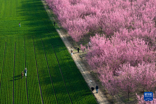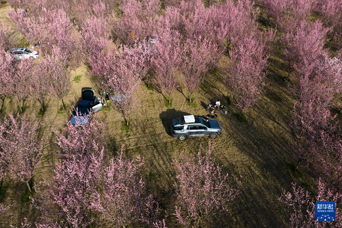 3月18日,游客在西安市鄠邑區(qū)甘河街道丁村梅花種植園游玩休閑(無人機照片)。(新華社記者 邵瑞 攝)