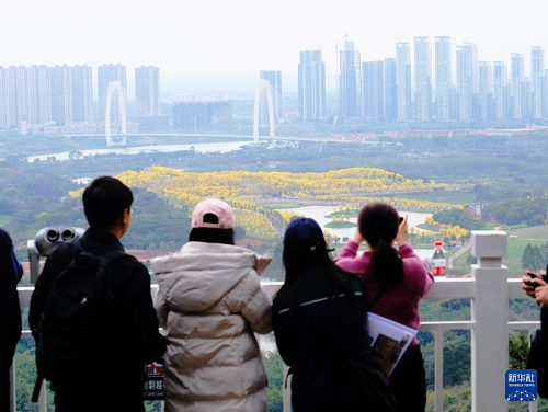3月19日,游客在廣西南寧市青秀山風(fēng)景區(qū)觀賞黃花風(fēng)鈴木。(新華社記者 周華 攝)