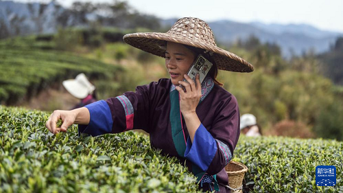 在三江侗族自治縣同樂苗族鄉(xiāng)寨大村茶園,一名茶農在給收青點報告當天茶青采摘量(3月21日攝)。(新華社記者 張愛林 攝)