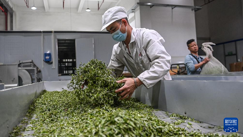 3月22日,在三江縣御香茶業(yè)有限公司車間,工人在處理收購的茶青。(新華社記者 張愛林 攝)