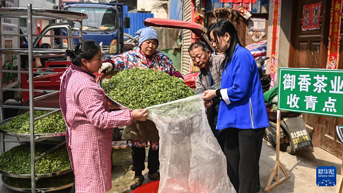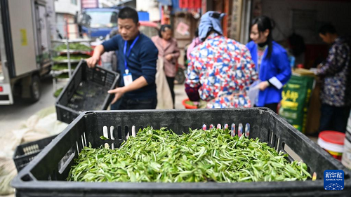 3月22日,在三江侗族自治縣獨峒鎮(zhèn)八協(xié)村,茶農在御香茶業(yè)收青點出售茶青。(新華社記者 張愛林 攝)