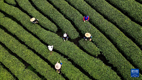 三江侗族自治縣同樂苗族鄉(xiāng)寨大村的茶農在山上采茶(3月21日攝,無人機照片)。(新華社記者 張愛林 攝)