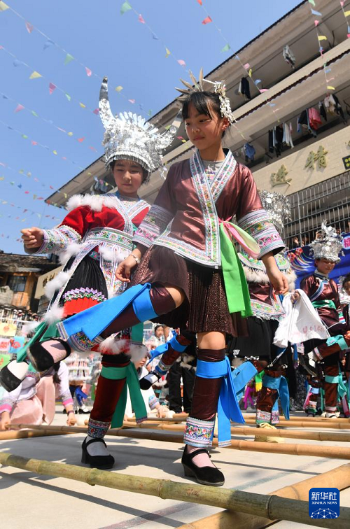 3月25日,柳州市融水苗族自治縣桿洞鄉(xiāng)中心小學學生在跳竹竿舞。(新華社記者 黃孝邦 攝)