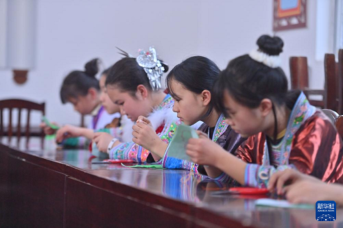 3月25日,柳州市融水苗族自治縣桿洞鄉(xiāng)中心小學學生在刺繡。(新華社記者 黃孝邦 攝)