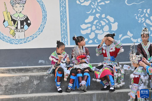 3月25日,柳州市融水苗族自治縣桿洞鄉(xiāng)中心小學學生進行演出前的準備。(新華社記者 黃孝邦 攝)