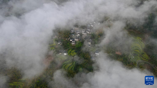 雨后初霽,位于安徽省黃山市徽州區(qū)呈坎鎮(zhèn)的靈山村出現(xiàn)云海景觀,縹緲的云霧與徽派民居、梯田花海相映成趣,美不勝收。