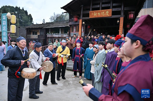 3月30日,人們身著傳統(tǒng)服飾在宣恩縣椒園鎮(zhèn)慶陽古街前表演國家級(jí)非物質(zhì)文化遺產(chǎn)“薅草鑼鼓”。(新華社發(fā) 宋文 攝)
