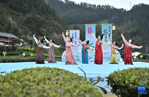 3月30日,身著傳統(tǒng)服飾的姑娘在宣恩縣椒園鎮(zhèn)慶陽古街的茶園里翩翩起舞。(新華社發(fā) 宋文 攝)