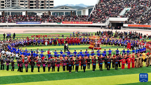 3月31日,當(dāng)?shù)厝罕娫趶V西三江侗族自治縣古宜鎮(zhèn)表演民族歌舞(無人機(jī)照片)。(新華社發(fā) 吳練勛 攝)