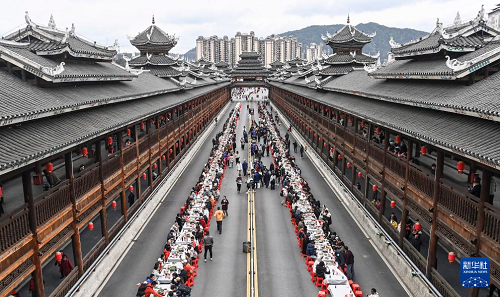 3月31日,在廣西三江侗族自治縣古宜鎮(zhèn),人們參加百家宴。(新華社記者 張愛林 攝)