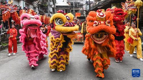 3月31日,龍獅隊(duì)在廣西三江侗族自治縣古宜鎮(zhèn)沿街巡演。(新華社記者 張愛林 攝)