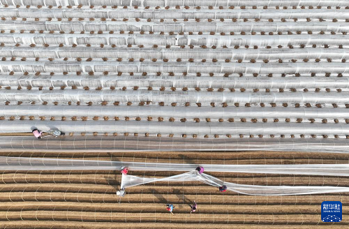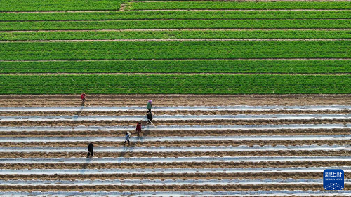 4月9日,河北省遵化市劉備寨鄉(xiāng)農(nóng)民在瓜田扣地膜(無人機(jī)照片)。(新華社發(fā) 劉滿倉 攝)