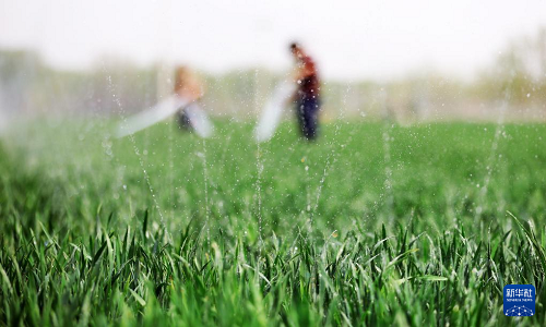 4月9日,山東省臨沂市郯城縣郯城街道農(nóng)民在田間澆水。(新華社發(fā) 張春雷 攝)