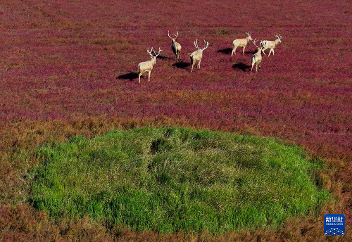 這是2024年10月29日在鹽城市東臺(tái)條子泥濕地拍攝的麋鹿(無(wú)人機(jī)照片)。(新華社記者 李博 攝)