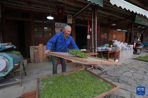 這是在磐安縣尖山鎮(zhèn)烏石村古民居間晾曬的茶青(4月10日攝)。(新華社記者 翁忻旸 攝)