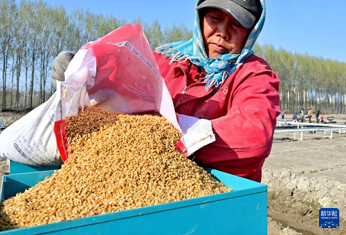 4月15日,唐山市曹妃甸區(qū)第四農(nóng)場的農(nóng)民將稻谷種子倒入育秧播種機。(新華社記者 楊世堯 攝)
