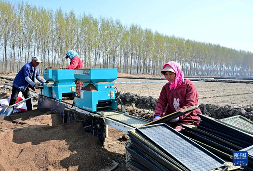 4月15日,唐山市曹妃甸區(qū)第四農(nóng)場的農(nóng)民在使用機械設(shè)備往秧盤上撒稻谷種。(新華社記者 楊世堯 攝)