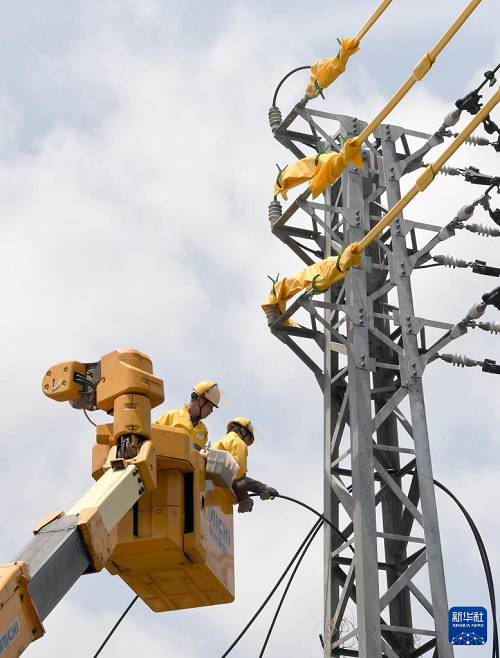 4月17日,在海南省陵水黎族自治縣華電陵水59.9MW分布式光伏發(fā)電項(xiàng)目現(xiàn)場(chǎng),電力工作人員進(jìn)行帶電接火作業(yè)。(新華社記者 趙穎全 攝)