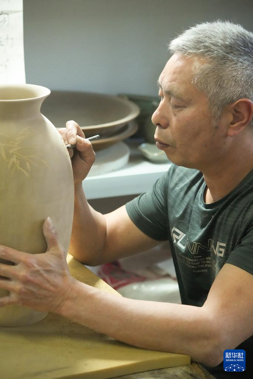 4月17日,施尚劍在位于慈溪市橋頭鎮(zhèn)的工作室往瓷坯上刻劃竹子。(新華社記者 翁忻旸 攝)