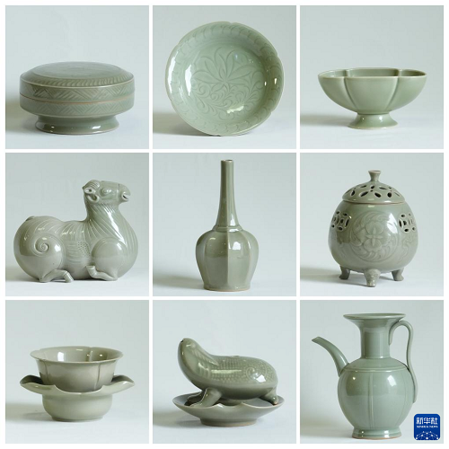 這是施尚劍燒制的越窯青瓷作品(拼版照片,4月17日攝)。(新華社記者 翁忻旸 攝)