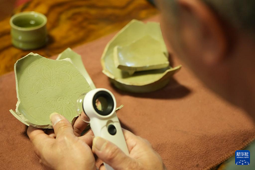 4月17日,施尚劍在位于慈溪市橋頭鎮(zhèn)的工作室查看古越窯青瓷殘片。(新華社記者 翁忻旸 攝)