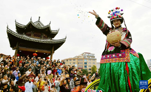 3月31日,在廣西都安瑤族自治縣舉辦的“三月三”活動(dòng)中,演員表演“瑤母巡山”。(新華社發(fā) 高東風(fēng) 攝)