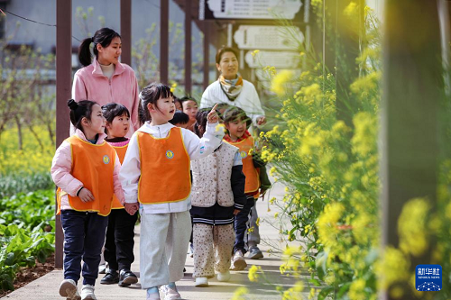3月31日,農(nóng)歷三月初三,在河南省焦作市博愛(ài)縣九街社區(qū),幼兒園的教師帶領(lǐng)小朋友踏青賞花。(新華社發(fā) 程全 攝)