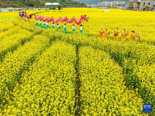 3月31日,農(nóng)歷三月初三,民間藝人在浙江省溫嶺市石橋頭鎮(zhèn)下宅金村表演(無(wú)人機(jī)照片)。(新華社發(fā) 徐偉杰 攝)