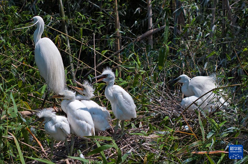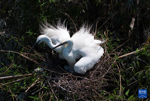 4月20日,在重慶市大足區(qū)珠溪鎮(zhèn),兩只成年白鷺在撫養(yǎng)剛出生不久的幼崽。(新華社記者 陳誠 攝)