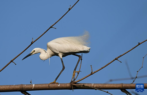 4月21日,在重慶市大足區(qū)珠溪鎮(zhèn),一只白鷺小心翼翼地走在竹枝上。(新華社記者 陳誠 攝)