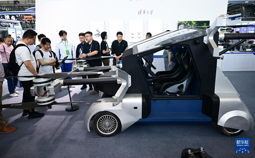 4月26日,觀眾在第三屆中國(安徽)科技創(chuàng)新成果轉(zhuǎn)化交易會上參觀一款飛行汽車。(新華社記者 周牧 攝)