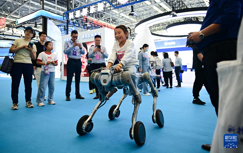4月26日,小朋友在第三屆中國(安徽)科技創(chuàng)新成果轉(zhuǎn)化交易會上體驗(yàn)一款機(jī)器狗。(新華社記者 周牧 攝)