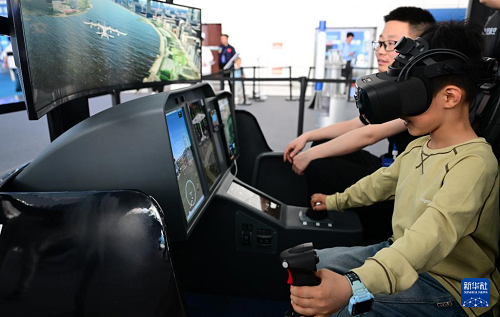 4月26日,小朋友在第三屆中國(安徽)科技創(chuàng)新成果轉(zhuǎn)化交易會上體驗(yàn)一款駕駛艙模擬器。(新華社記者 周牧 攝)