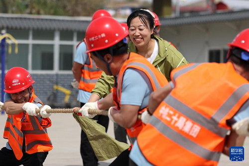 4月29日,中鐵二十局的建設(shè)者參加拔河比賽。(新華社記者 陳斌 攝)