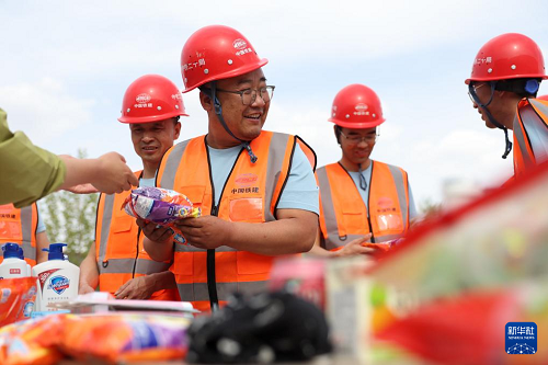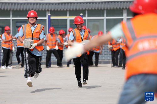 4月29日,中鐵二十局的建設(shè)者參加混凝土接力搬運(yùn)比賽。(新華社記者 陳斌 攝)
